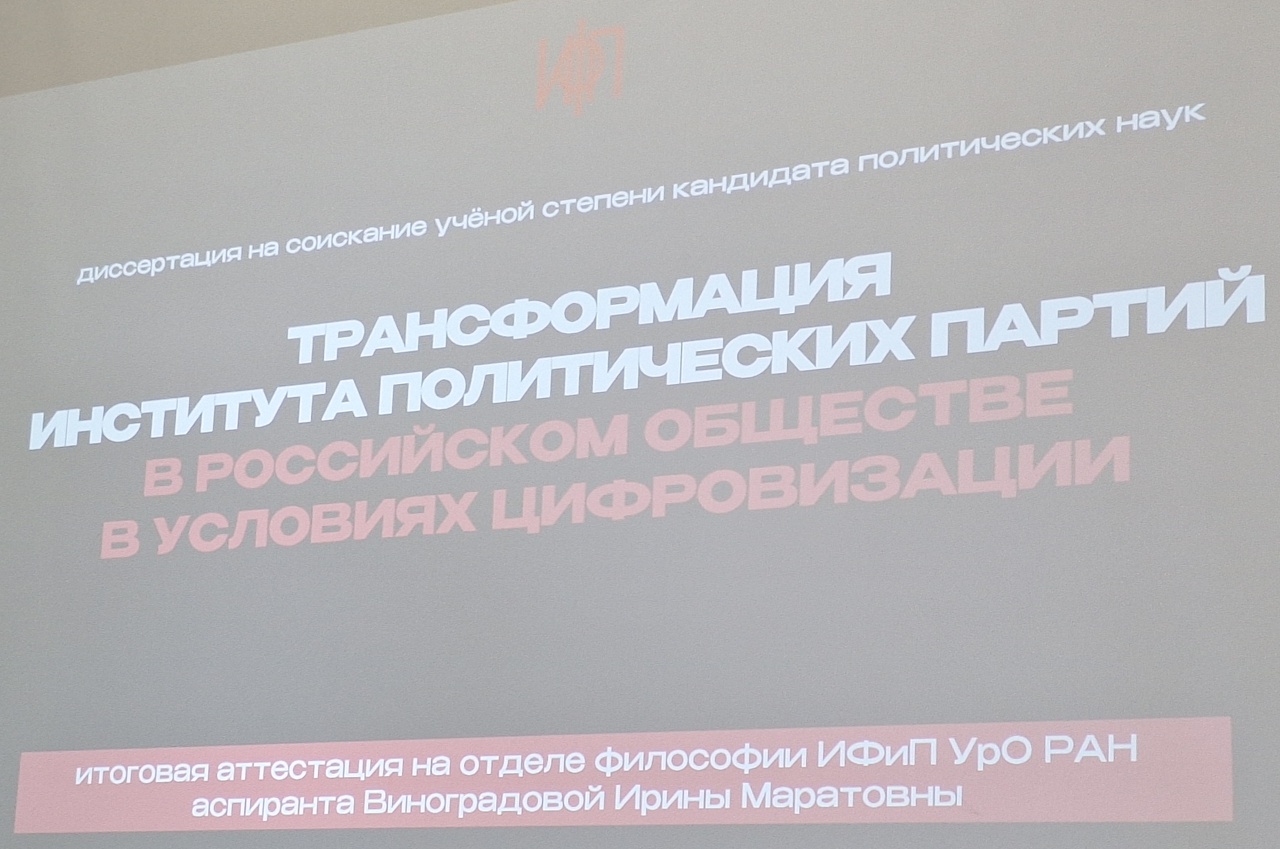 События 27 октября 2025 года в отделе философии состоялась итоговая аттестация аспиранта Института философии и права УрО РАН Ирины Виноградовой в форме оценки диссертации "Трансформация института политических партий в российском обществе в условиях цифровизации" на предмет ее соответствия критериям, установленным в соответствии с Федеральным законом "О науке и государственной научно-технической политике".