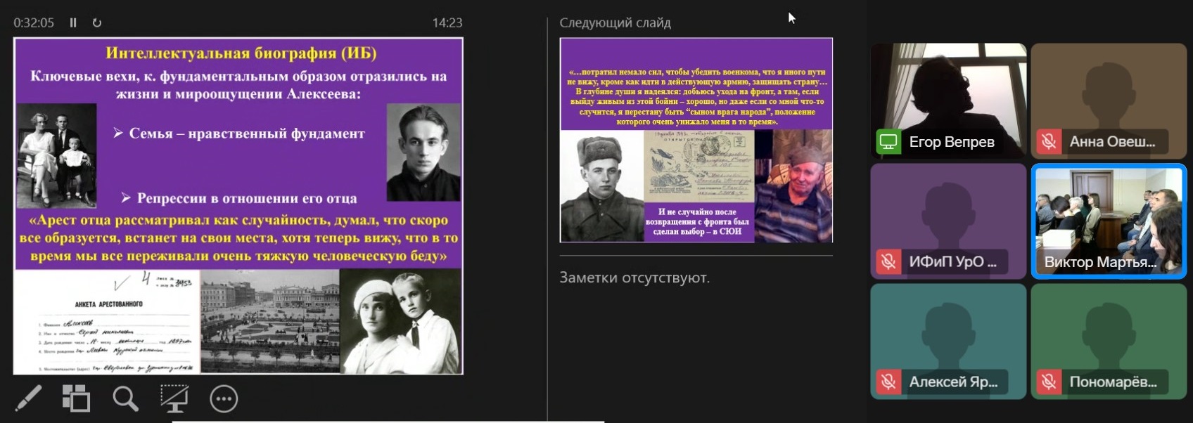 Докладчик ответил на вопросы, касающиеся изменения политических взглядов мыслителя после прекращения работы в Институте философии и права УрО РАН, его отношения к процедурам проведения конституционных реформ, наиболее важном вкладе Сергея Алексеева в науку. В завершение семинара заведующий отделом права Михаил Казанцев подарил Алексею Семитко памятные фотографии, сделанные в первые годы существования Института.