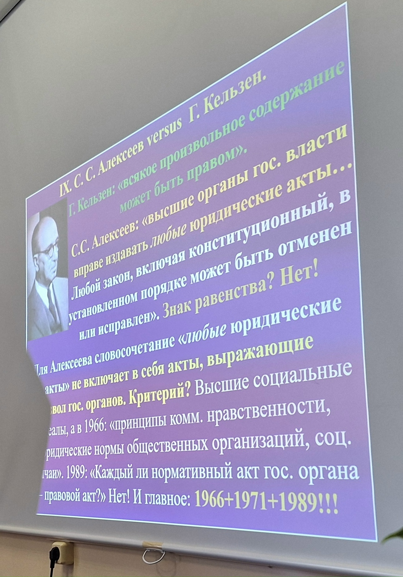 В выступлении были затронуты вопросы развития научного и практико-правового наследия Сергея Алексеева применительно к современности, трансляции его идей новым поколениям юристов. Приведены примеры влияния на российскую юриспруденцию разработанных мыслителем концепций. Оценено социально-политическое влияние Сергея Алексеева, в частности, выдвинутая им на I Съезде народных депутатов СССР идея о принятии новых российских Конституции и гражданского законодательства. Разграничены понятия интеллектуальной и научной биографии исследователя. Рассмотрено влияние непростых обстоятельств жизненного пути мыслителя на выбранный им научный путь и понимание права не как воли пролетарского класса во главе с КПСС, а как института, защищающего человека от произвола властей. Опровергнуто мнение о защите Сергеем Алексеевым советского строя: в своих работах выдающийся правовед апеллировал не к его практике, а к принципам Октябрьской революции, при этом используя обязательные в то время официальные идеологические формулировки. Разоблачен миф о резкой смене позиции Сергея Алексеева после распада СССР: его авторский подход к праву был разработан еще в советский период, но его открытое обсуждение тогда было невозможным.