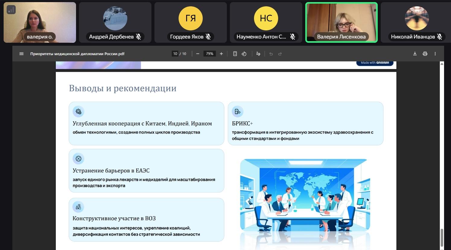 В докладе, подготовленном в рамках гранта Российского научного фонда № 24-28-01127 , было проанализировано, как под влиянием внешних ограничений медицинская дипломатия России эволюционировала из инструмента гуманитарного сотрудничества в важный компонент национальной безопасности и механизм поиска стратегических союзников. Основное внимание было уделено двум взаимосвязанным направлениям: внутреннему курсу на ускоренное импортозамещение для достижения технологического и лекарственного суверенитета; внешнеполитическому развороту к альтернативным многосторонним форматам. Была рассмотрена активизация деятельности России на площадках БРИКС+, ШОС, ЕАЭС и СНГ, где продвигаются инициативы по гармонизации регулирования, созданию совместных производств и развитию независимых систем эпидемиологического контроля. Отдельный сюжет доклада был посвящен изменениям отношений с ВОЗ, заключающимся в постепенном переходе от широкого партнерства к выборочному прагматичному взаимодействию, что нашло отражение в Концепции внешней политики Российской Федерации, утвержденной в марте 2023 года. Сделан вывод о постепенном формировании новой парадигмы, в которой медицинская дипломатия служит не только инструментом защиты суверенитета в сфере здравоохранения, но также механизмом выстраивания коалиций единомышленников и конкурентной многополярной архитектуры глобального управления. В заключительной части выступления были сформулированы практические рекомендации, направленные на повышение эффективности медицинской дипломатии России: углубление производственной кооперации с ключевыми партнерами; инициирование сближения систем здравоохранения участников БРИКС+; завершение формирования единого рынка лекарств и медицинских изделий в рамках ЕАЭС; избирательное, но конструктивное участие в инициативах ВОЗ.